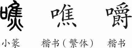 “嚼”是形声字。小篆从口,焦声;又作“嚼”,爵声。隶变后楷书写作“噍”和“嚼”。如今规范化,以“嚼”为正体。