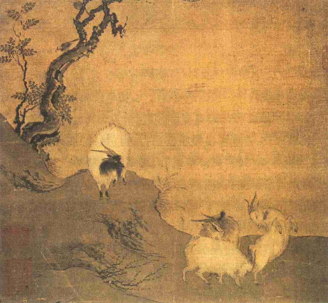 陈居中善画人物番马,但于一般动物,也画得相当出色。这幅《四羊图》,画四只山羊或叫或跳,或抵或望,姿态各异,形象生动。