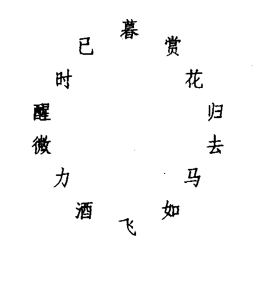 这是又一种回文诗,从圆环的右上角读起,每句重迭前句三至四字,形成一首七绝: