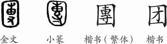 “团”是会意字。金文从囗(围绕),从專(专,旋转),会能围绕旋转的圆形之意。小篆整齐化。隶变后楷书写作“團”。汉字简化后写作“团”。