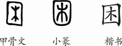 “困”是会意字。甲骨文像房屋的四壁,里边是生长的树木。小篆的形体与甲骨文大致相同。隶变后楷书写作“困”。