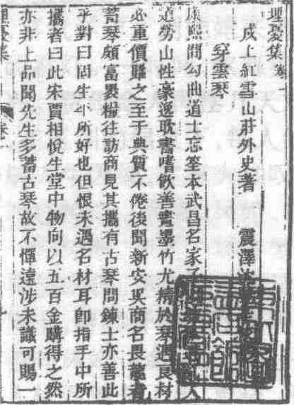 句曲道士忘筌,性豪逸,尤精于琴,遇良材,必重价购之,至于典质不倦。后闻吴商名畏龙者,蓄琴颇富,往访之,见其珍藏之穿云琴,质理密栗,古色黝然,爱玩不