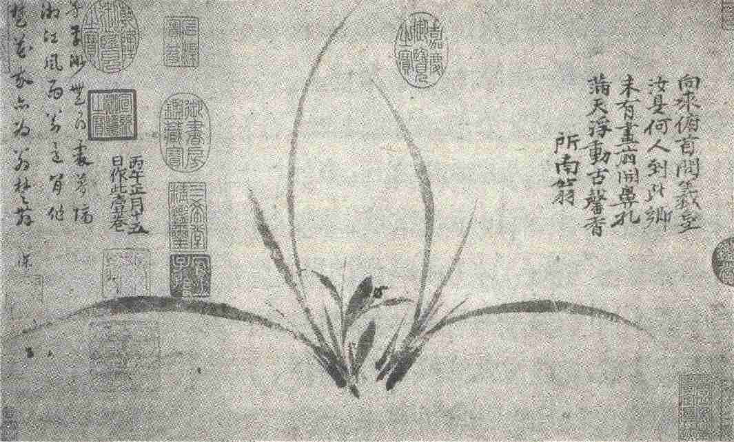 本幅自题的四句诗,是将兰花拟人化,以第一人称,表述兰花只向羲皇俯首,询问画家因何来此仙乡,欣然在作画之前开放,散出的幽香满天浮动。诗借兰花自述,表露兰花高洁清幽之质,并衬托出画家超凡脱俗的志趣。这种以诗配画的手法,缘物抒情深化了题意,也是郑思肖常用的。