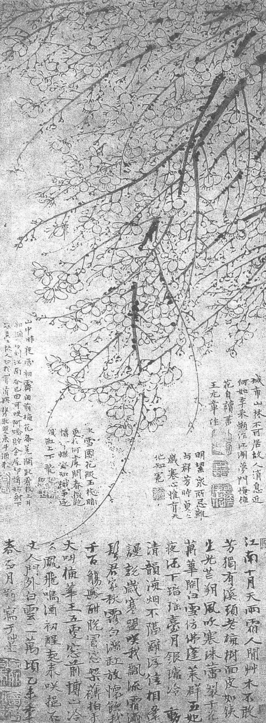 图上的题诗雄奇跌宕,直摅性灵,使画品、诗品、人品融为一体,令观者品味无穷。此图作于至正十五年(1355),是王冕晚年画梅艺术臻于化境的精心之作,故而深为后世文人所珍重。诗塘及裱边四周题满诗跋,相继有明代祝允明、陆深、谢承举、文徵明、薛章宪、王宠、徐霖、王韦、唐寅、陈沂等名诗人、名画家、名书家的题诗,尤为此图添彩增辉。