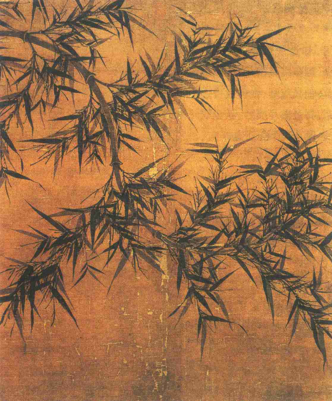 图写倒垂竹枝一梢,枝叶离披,临空摇曳,犹如飞凤展翅。用笔沉着劲利,枝干用墨略淡,节距远,实按虚起,一抹便过,茎多新枝,渍以淡墨,生机蓬勃。叠叶疏密得宜,因风得势,反正向背,卷舒自若。用撇笔作长叶而颖锋不露,叶尾腾笔飞白以示风动折旋之势。图后行书署款“与可”两字,墨色深入绢丝,间架舒坦,落笔停匀坚实,神完气足,与画面简重秀逸的笔致前后辉映,相得益彰。文同善书法,篆隶行草各体皆能。此图的落款,经与他熙宁五年壬子(1072)在范仲淹《道服赞》墨迹后题跋的落款相比,两者的结体用笔以至点画转折悉相符合,可以确证是文同真迹无疑。