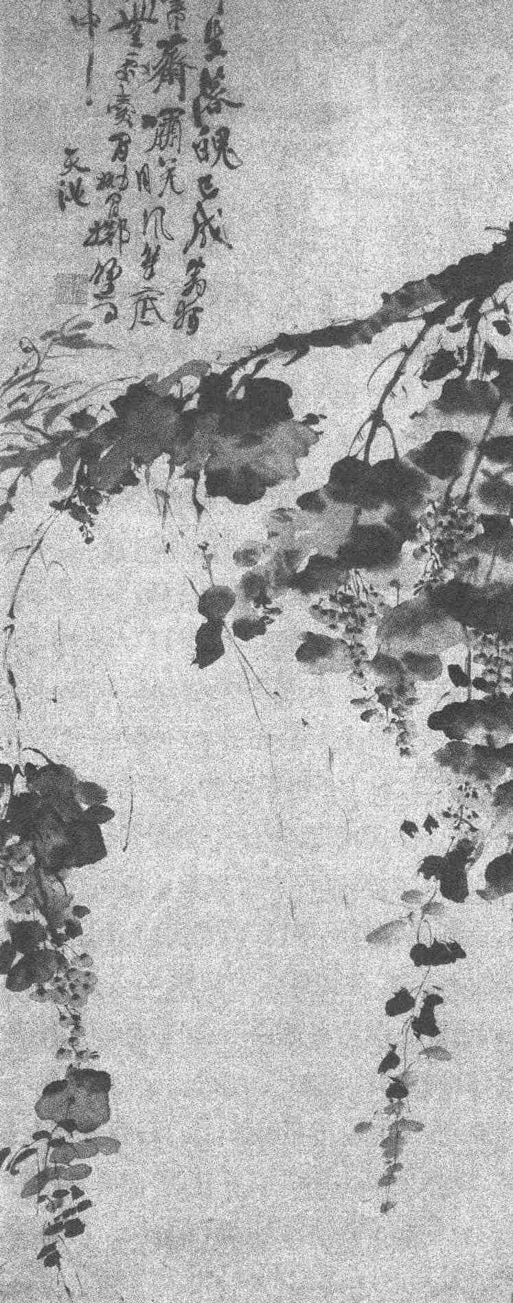 徐渭《墨葡萄图》左上自题:“半生落魄已成翁,独立书斋啸晚风。笔底明珠无处卖,闲抛闲掷野藤中。天池。”钤朱文“湘管斋”印。