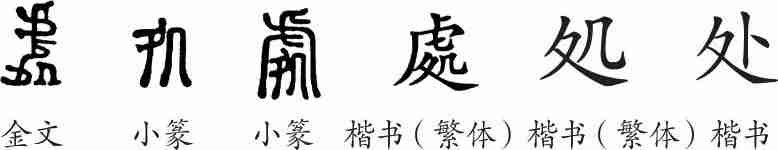 “处”是会意字。金文形体像一只蹲踞的老虎,下部右边的“几”可能是虎足的变形。小篆承接金文而来。隶变后楷书写作“處”和“処”。汉字简化后写作“处”。