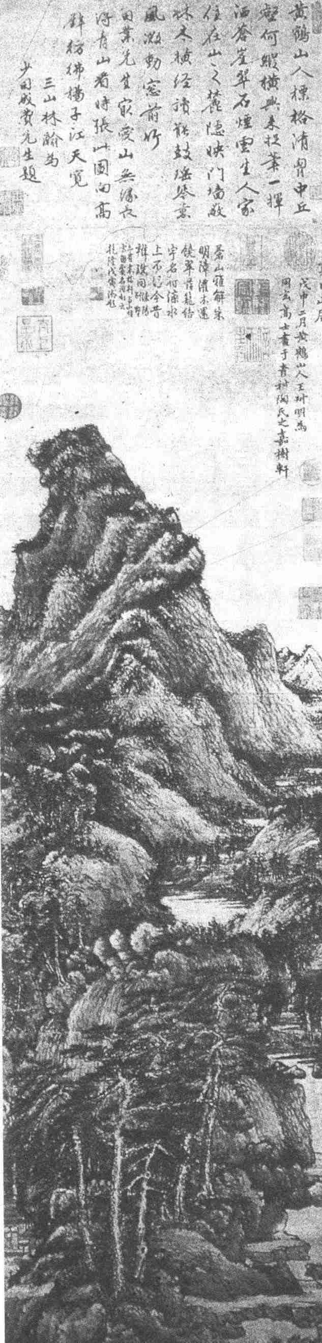 诗塘中有明人林瀚题记:“黄鹤山人标格清,胸中丘壑何纵横。与来捉笔一挥洒,苍崖翠石烟云生。人家住在山之麓,隐映门墙蔽林木。横经读能鼓瑶琴,薰风微动窗前竹。”“司业先生最爱山,无缘长得青山看。时张此图向高辟,仿佛扬子江天宽。三山林瀚为少司成费先生题。”以“元四家”为代表的元代山水画写意的特点,不仅在笔墨形式上趋于简率粗略,更在于内在的表达意境观念的改变,和后来一些文人画过分强调抒情而轻视造型、流于简率空泛有很大的不同,这是由于王蒙能将笔墨形式美和表达内涵达到有机统一的缘故,反映了从宋人以理法为主,以神趣为归,向元人以简逸之韵胜前人工丽之作的画风变格。
