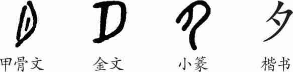 “夕”是象形字。在甲骨文和金文中,“夕”字与“月”字几乎一模一样。小篆的“夕”比“月”字少了一笔,表示月儿尚未露出全貌。隶变后楷书写作“夕”。