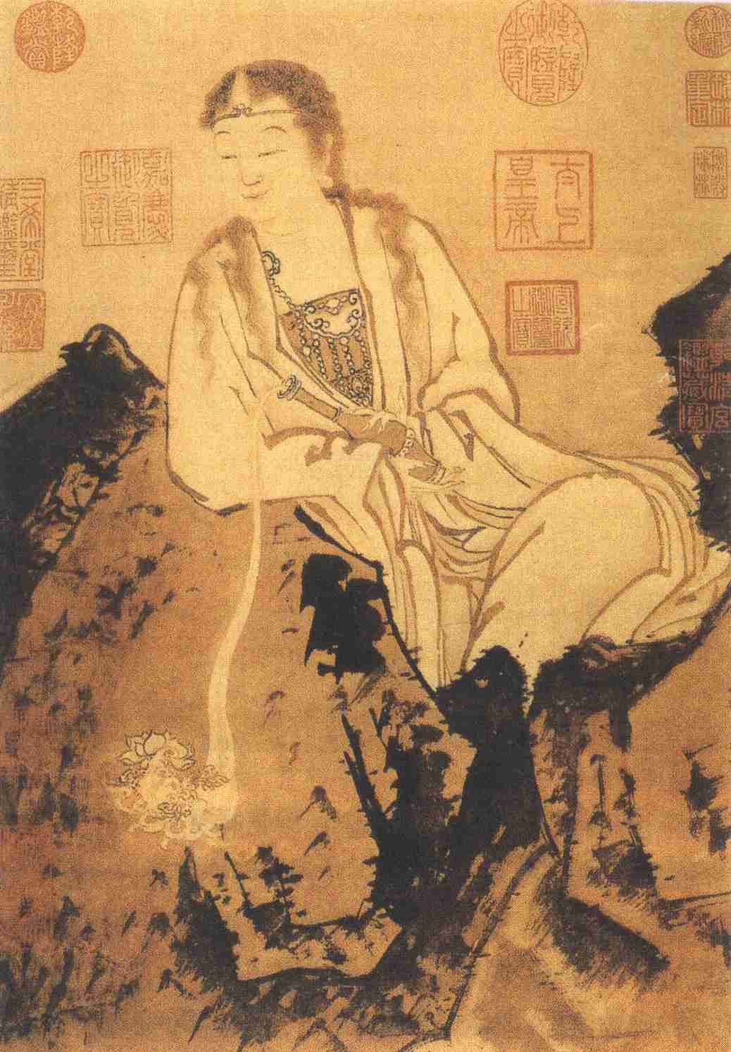 贾师古是南宋绍兴画院中的画家,擅长人物。建炎、绍兴时期出现的一些崭新的画法,如山水画皴法的简括粗阔、酣畅淋漓的水墨风情、一角半边的构图等等,在贾师古身上已得到体现,并不断在深入探寻这种新兴画法。贾师古的《大士像图》,一展卷,浓烈的南宋情调便扑面而来。观音大士双手持瓶,坐于石间,那石画得石体坚硬似铁,石面如斧劈刀凿般,见角见棱,质感可辨,其笔法的简练、笔力的厚重,令人叫绝。画家的概括能力和写实水平,已臻化境。同样令人叫绝的是作为主角的大士形象的描写。它有三个显著的特点。第一是开相的特点,其面相圆润方正,面额宽敞,眉宇开阔,慈目善鼻,玉项朱唇,一派菩萨相。这是画家在充分理解人性的基础上塑造的理想中的救世主形象,它具有中原人的特征,又因略卷微曲的长发而点明了来自西方的渊源。第二是体态的特点。大士一手依石,身体微微向左倾斜,但重心却端坐于石上。这一小幅度的倾斜,构成了悠然自得,闲适洒脱,一切随意,又一切均在掌握之中的无所为而无所不为的情境,这是在端庄中透露出它的微妙动态。画家运用了体态的造型,描写出了大士的典型形象,描写出了瞬息之间的大士心态和只有观音大士才具备的意趣、意境。开相、体态,是观音大士形象的一个整体,画家关注的是形象,而形象之中所阐发的是宗教之义?是人性人情?都可由观者自认。第三是描写手段。整个大士像的描写手段,应当说是白描,也即全用线条来表现。虽说大士着大袖宽袍,却如“曹衣出水”般地贴身,而衣褶线条,则是“吴带当风”般地舒展,笔迹的起伏跌宕,有顿有挫,又正显示着“莼菜条”似的线性魅力。不过,它稍稍地收敛了飘逸,将劲遒爽利作为主旨,完全是南宋的吴生风范。脸部的洗练,衣褶的简洁,又一览无遗地亮出南宋线描的最高水准。这尊观音大士像,主题明确、主角突出,形象与观众十分贴近,是南宋构图删繁就简、强调近景的特点,因此,我们可以从这幅《大士像图》中,读到许多南宋绘画的音息,从中可以了解南宋绘画的大概。