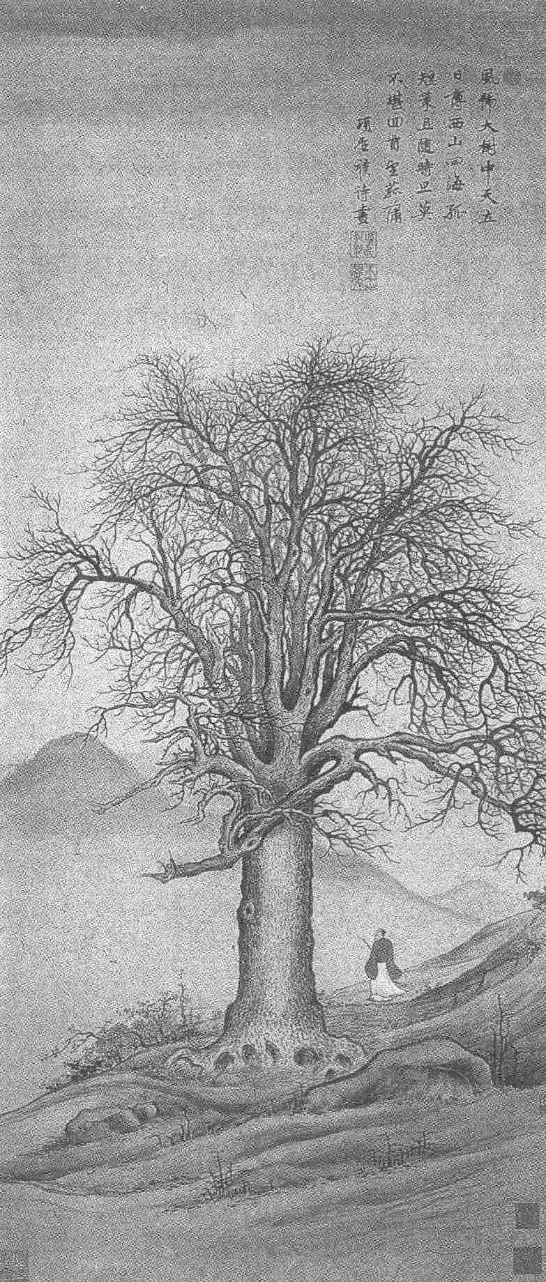 在《大树风号图》里,作者所寄托的国破家亡后对明王朝的怀念,使我们自然地想起了庾信的《哀江南赋》。庾信是南北朝时期的南梁贵族,在他出使北朝西魏期间,南梁灭亡。《哀江南赋》一开始写道:“粤以戊辰之岁,建亥之月,大盗移国,金陵瓦解,余乃窜身荒谷,公私涂炭……”这情形与项圣谟的遭遇有近似之处,自然要引起项氏思想上的共鸣。赋中又有句道:“日暮途远,人间何世。将军一去,大树飘零。壮士不还,寒风萧瑟。”赋中“日暮”、“大树”、“寒风”这些形象,都可以在《大树风号图》诗、画中鲜明地感受得到。很有可能,当项圣谟在孕育、构思这一作品时,曾经受到《哀江南赋》的启发和影响,或者正是有意借此暗藏他要表达的深刻的主题,因为清初的统治是非常严酷的。