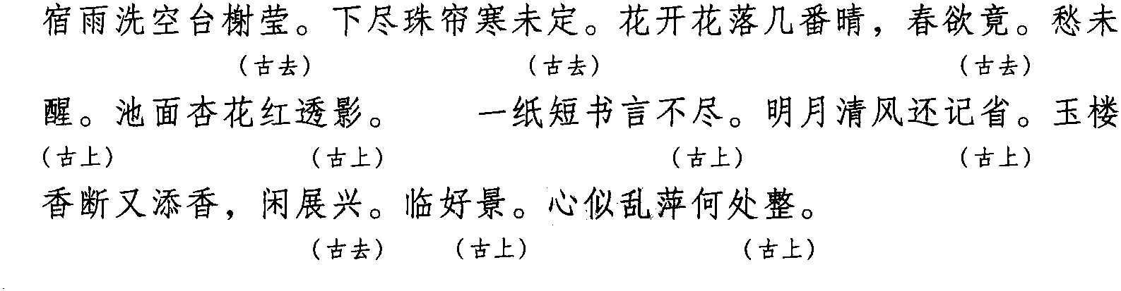 注: 本词例押古上声“轸” “梗” “迥” 韵,古去声“敬” “径” 韵。因 “梗”“敬” “径” 在现代韵中属 “声”韵,“轸” “迥” 与 “声” 属通韵,故全调可押东部“声” 韵。