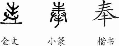 “奉”是会意字。金文像用双手捧着禾麦奉献给神祖之形,会向神祖拜祭祷告、祈求丰收之意。小篆的字形线条化、复杂化。隶变后楷书写作“奉”。