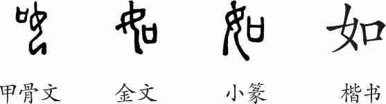 “如”是会意字。甲骨文左边为“口”,右边是一个朝左跪着的女人,会从命之意。金文和小篆都直接由甲骨文演变而来。隶变后楷书写作“如”。