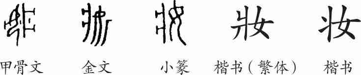 “妆”是形声字。甲骨文从女,爿声。金文与甲骨文大致相同,小篆整齐化。隶变后楷书写作“妝”。汉字简化后写作“妆”。