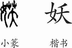 “妖”是会意兼形声字。小篆从女从夭(表示舞动着的人)会意,夭兼表声。隶变后楷书写作“妖”。