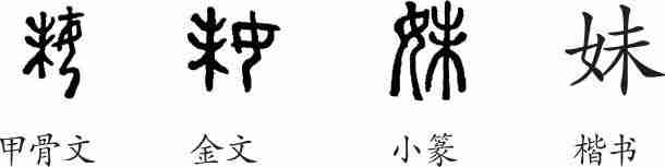 “妹”是形声字。甲骨文右边是一个半跪着的女子,表形;左边“未”表声。金文字形与甲骨文大致相同。小篆将“女”和“未”的位置对调。隶变后楷书写作“妹”。