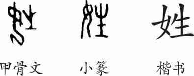 “姓”是会意兼形声字。甲骨文从女(姓是母系社会的反映,故从女),从生,生兼表声。小篆整齐化。隶变后楷书写作“姓”。