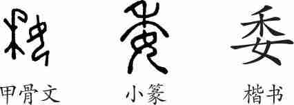 “委”是会意字。甲骨文从女,从禾,像古代秋收时妇女钎(裁)取割倒堆在地上的谷穗的丰收景象,用以会禾谷堆积之意。小篆整齐化。隶变后楷书写作“委”。