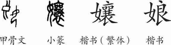 “娘”是形声字。甲骨文从女,良声。小篆改为从女,襄声。隶变后楷书写作“孃”。汉字简化后写作“娘”。