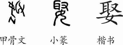 “娶”是会意兼形声字。甲骨文从女从取会意,取兼表声。小篆由甲骨文演变而来。隶变后楷书写作“娶”。