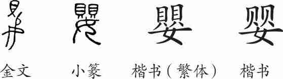 “婴”是会意字。金文貝,下为女,会妇女颈上挂着贝做成的装饰品之意。小篆上部变为两只貝,下仍为“女”,意义没变。隶变后楷书写作“嬰”。汉字简化后写作“婴”。