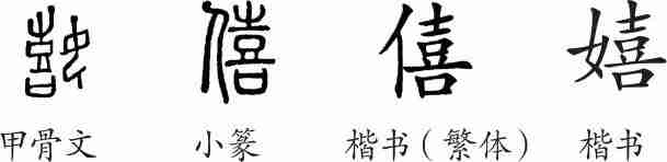 “嬉”是会意兼形声字。甲骨文左边是“喜”,右边是跪坐的女子,喜兼表声。小篆中“女”讹变为“人”。隶变后楷书写作“僖”和“嬉”。如今规范化,以“嬉”为正体。