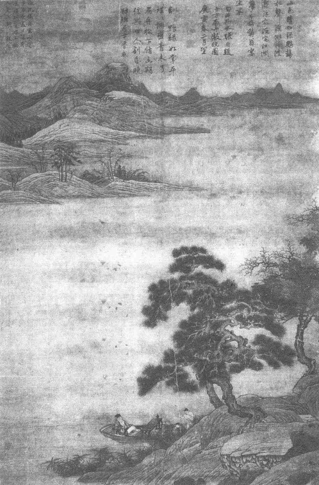 此图无款。画上有元代张雨、鲁威、张翥三人题诗。张雨诗题:“山色晴如绿鹦鹉,松声凉似海波涛。浮家泛宅江湖梦,不及髯翁宴座高。”鲁威诗题:“粼粼鸭绿如掌平,淡淡烟峦青未了。扁舟松下结幽期,信与世人割昏晓。”张翥诗题:“傲兀扁舟云水滨,笔床茶灶日随身。底须别觅君家号,又是江湖一散人。”其中张雨题诗后有跋言明本图为“子方扁舟傲睨图”。