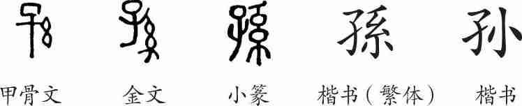 “孙”是会意字。甲骨文从子,从糸(表示连续),会子与子相连续之意。金文、小篆与甲骨文大致相同。隶变后楷书写作“孫”。汉字简化后写作“孙”。