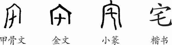 “宅”本为形声字。甲骨文从宀,乇声。金文的形体同甲骨文相似,小篆承接金文而来。隶变后楷书写作“宅”。