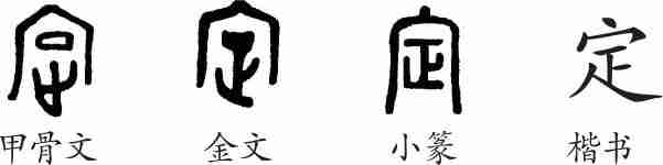 “定”是会意兼形声字。甲骨文从宀(表示房屋),从正(前往),会到房中止息、安定之意。金文大致相同。小篆整齐化。隶变后楷书写作“定”。