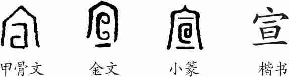 “宣”是会意兼形声字。甲骨文从宀(房屋),从回(河水漩涡)。小篆变为从亘(xuān),会装饰有回环水云纹的大房子之意,亘兼表声。隶变后楷书写作“宣”。
