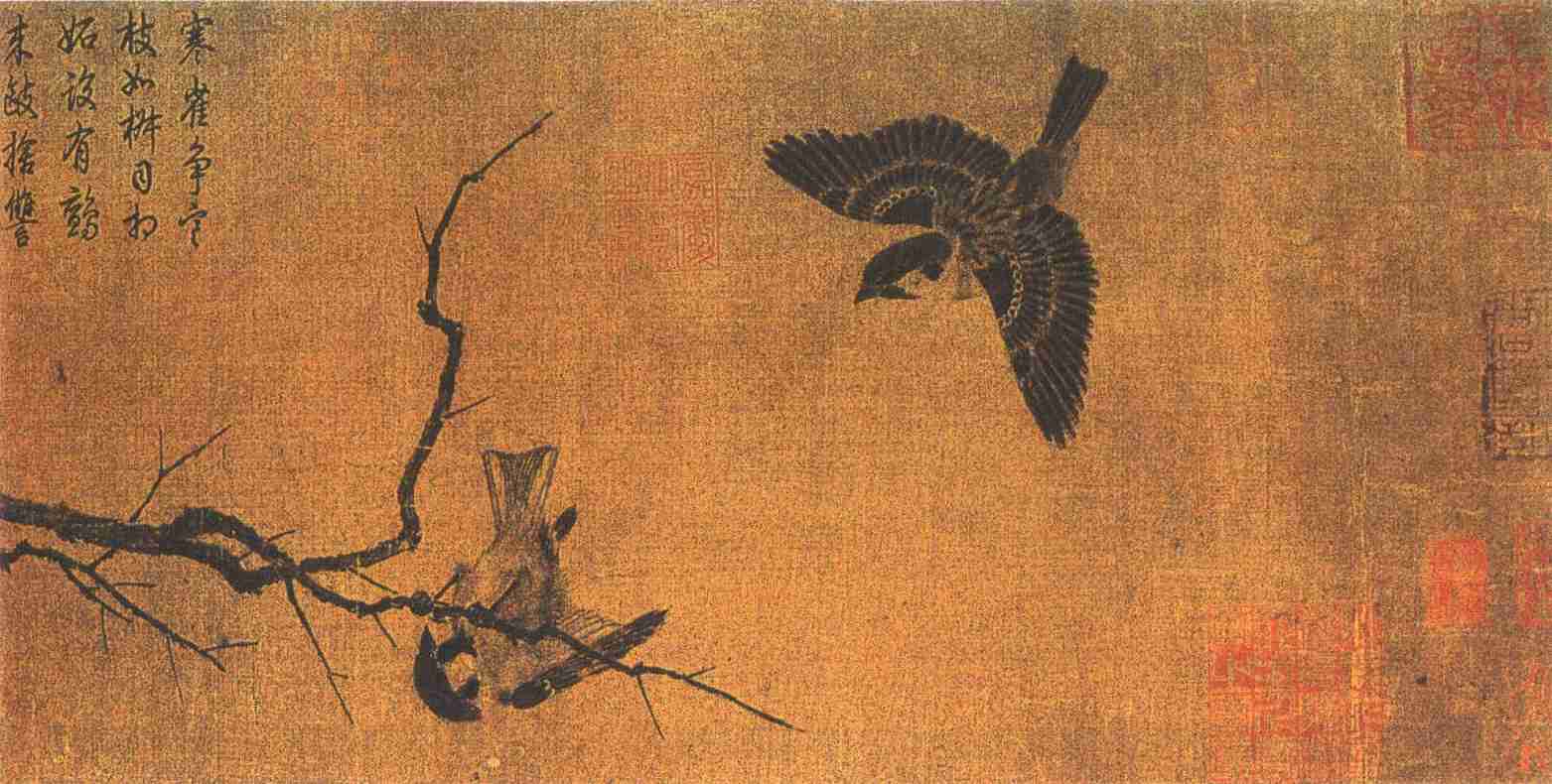 鸟类中和人接触最早最多的,麻雀当是其中之一。根据文献记载,从花鸟画发展之初的南朝宋之顾景秀,便是以画蝉雀扇开端的。《历代名画记》卷六《顾景秀传》说:“宋武帝时画手也……武帝尝赐何戢蝉雀扇,是景秀画。后戢为吴兴太守,齐高帝求好画扇,戢持献之,陆探微、顾宝光见之,皆叹其巧绝。……始变古体,创为今范,赋彩制形,皆有新意。扇画蝉雀,自景秀始也……”其后,蝉雀便成为花鸟画的传统题材之一,如南齐的丁光,谢赫《古画品录》便说他“擅名蝉雀”。唐代刘孝师画“鸟雀奇变,甚为酷似”(《历代名画记》)。大花鸟画家边鸾“凡草木、蜂蝶、雀蝉,并居妙品”(《唐朝名画录》)。五代黄筌《珍禽图》中有麻雀。元王渊摹黄筌《竹雀图》今尚存世。宋初黄居寀的《山鹧棘雀图》有山雀,辽宁辽墓出土的花鸟画轴有麻雀。到了北宋中期的崔白,尤以画雀著名。董逌《广川画跋·书崔白〈蝉雀图〉》说:“崔白为蝉雀,近时为绝笔,非居宁、牛戬辈可颉颃其间。”文献所载及今存崔白以麻雀为题的作品有《水墨雀竹图》、《蝉雀图》、《喧晴图》、《寒雀图》。《寒雀图》是他今存画雀的代表作。