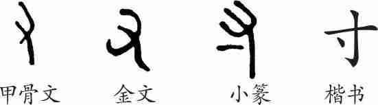 “寸”是指事字。甲骨文和金文像手的形状。在小篆的形体中,手下部左侧有一小横,指的是手腕一寸之处。隶变后楷书写作“寸”。