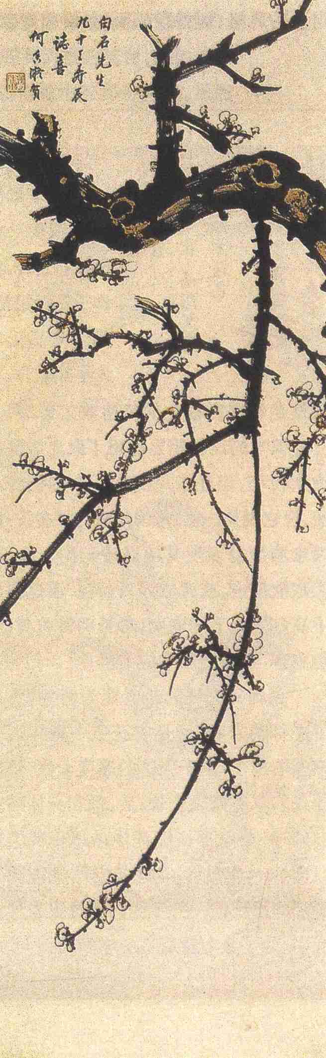 此图是何香凝20世纪50年代为齐白石九十三岁寿辰贺寿之作。画面梅干老曲有致,枝杈交错挺拔,梅树取折枝态势,一反俗忌,倒枝下探,不惧“倒楣”(梅)之诮。何香凝画梅讲究铁骨钢筋、画面搭配。构图上注意了一个“女”字,因为以“女”字出干布枝,具有错落有致、顾盼生姿的功效,而且画梅主要难度也就在于枝干的摆放合理合情合韵。此图在梅花的处理上也繁简得当,向背得法。或花或蕾,怒放未发,相互呼应,彼此默契。精思妙想,纯任自然。黑干白花,刚柔相济,对比强烈,寓意深远。