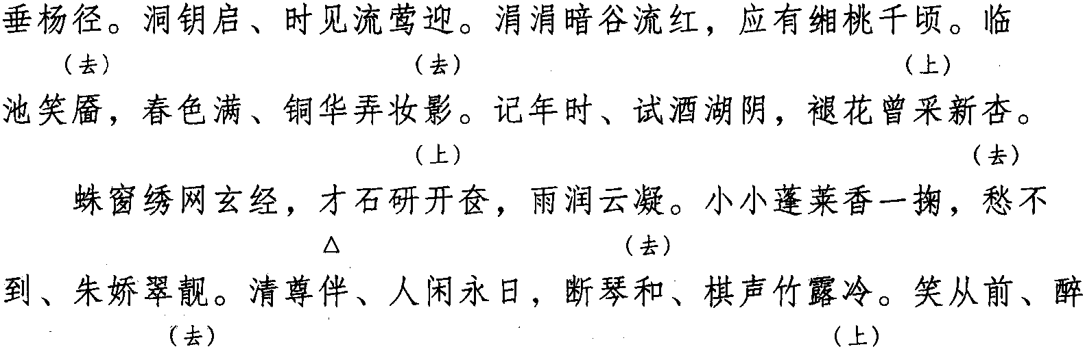 注:本词例押东部“声”韵。本押古上声“梗” 韵,古去声“敬” “径”韵。因“梗” “敬” “径”在现代韵中属“声”韵,故全调可押东部“声” 韵。