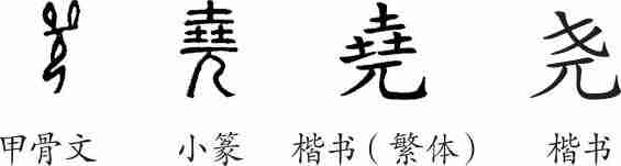 “尧”是会意字。甲骨文的上部是两堆土,下部是面朝左的一个人,表示高。小篆的形体变成了人的头上有三堆土。隶变后楷书写作“堯”。汉字简化后写作“尧”。