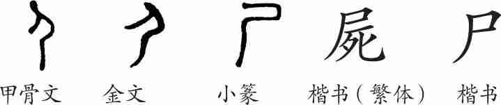 “尸”是象形字。甲骨文形体像一个面朝左、屈身弯腿而卧的人。金文大致相同,小篆整齐化。隶变后楷书写作“尸”。