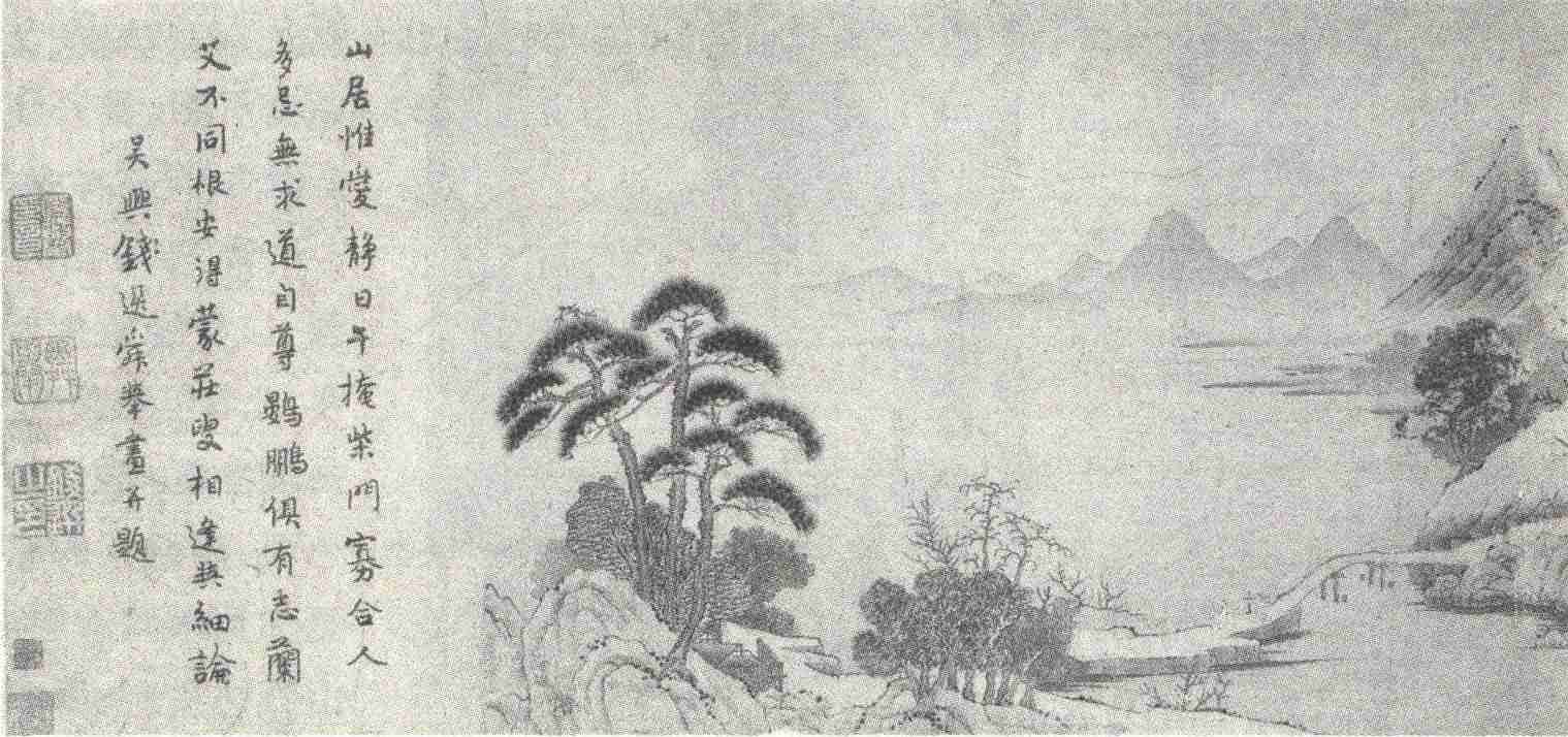 “居水村而慕山林者,往往厌尘喧而乐幽僻,岂以山林为深静,而喧嚣之所不到乎,此古之幽人清士,每依山以结庐也。”这是此卷卷后明人俞贞木所题的一段话,点示了图意。