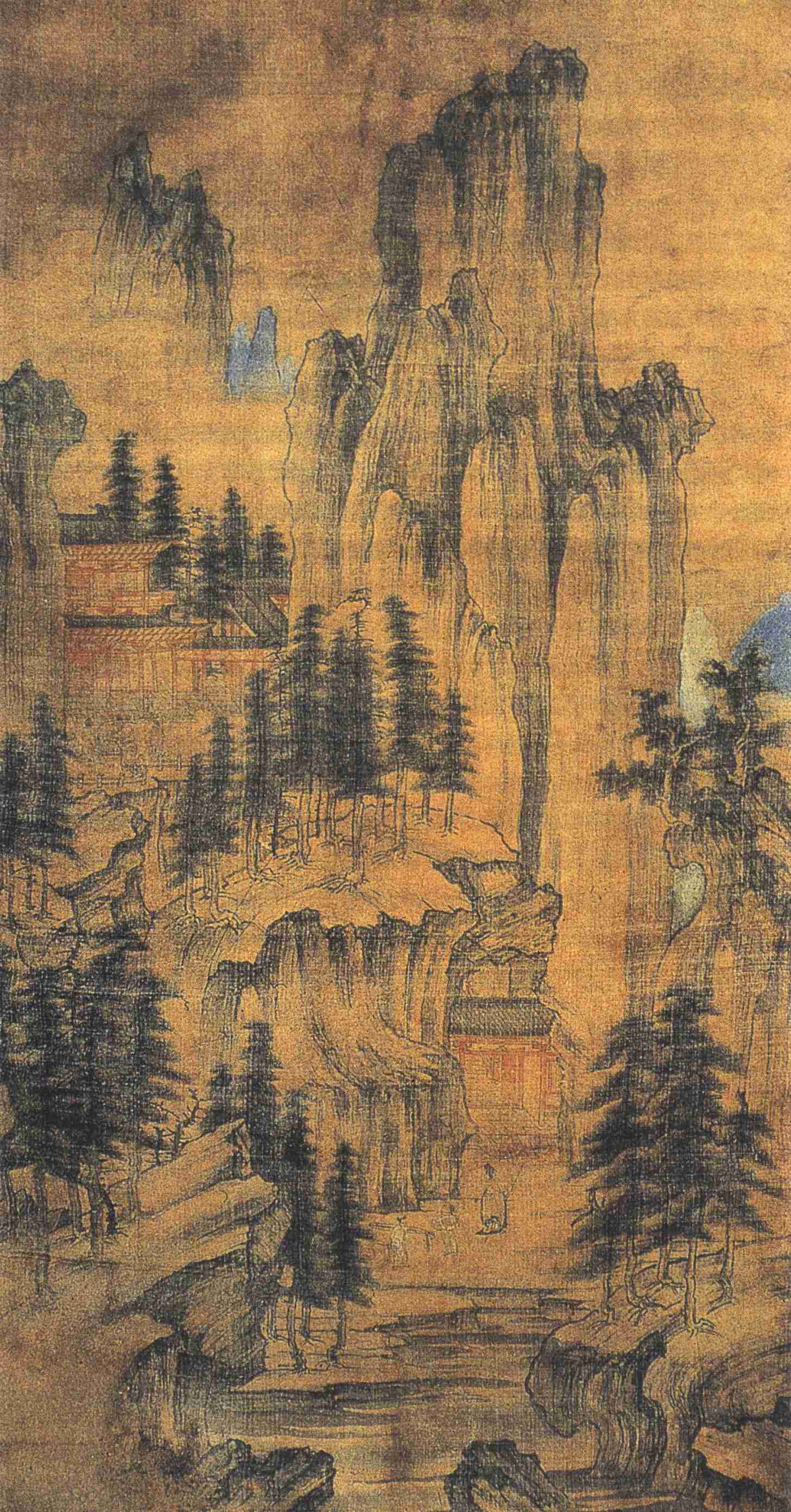 图中深山楼阁,楼前平坡曲栏,两人对坐弈棋,一童子侍侧;栏外巨崖横出,屋宇半掩,一人高冠策杖缓步,或为不速之客,后一童肩长琴,一童负酒葫芦;人物之间呼应生情。作者描绘士大夫隐逸悠闲的生活场景,而为了烘托这个气氛,对周围的自然景物及其位置、形状等,煞费经营。且看坡石层叠,坡上长松成林,楼阁掩映其间,坡后双峰拔起,峰外白云缭绕,高与天接,云中复见远峰三五。正是在这又高又深又远的层次与气势之中,寄寓着弈棋艺术之既高且深而又悠远的精神境界。