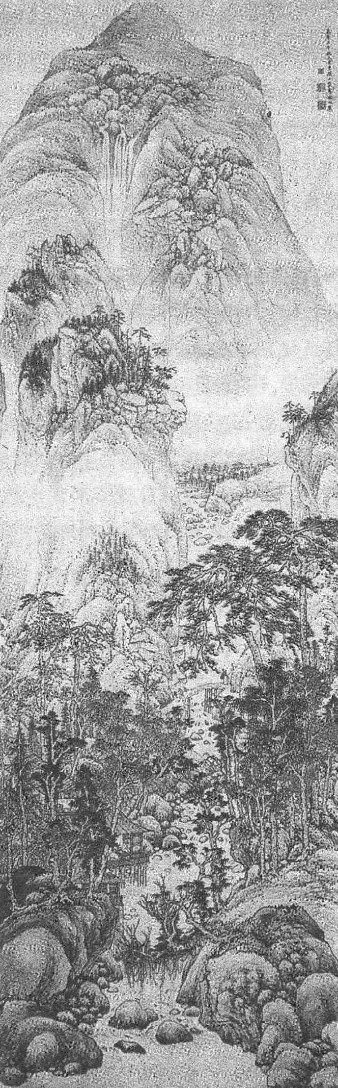 作于万历十年(1582)的这幅《山水图》,下部树木蓊郁,临流筑水阁数间,有二人在阁中对饮,远处林木间有溪桥可通,上有客携杖来访。中部松林掩映,有山径可登。上部重山复岭,云气缭绕,虽主峰兀立压顶,比之下部丘壑反觉空灵,峰间有瀑布奔泻而下,气势磅礴,可称大章法、高手笔。整幅画气派雄伟,树石用笔,法度谨严,远近分明,仿佛亲临其境。明韩昂《图绘宝鉴续纂》称他:“学画于沈石田,山头树木,苍劲古拙,巨幅大幛,颇有气势,信乎强将之下也。”清徐沁《明画录》也称他:“所画山水,高华苍蔚,名擅一时。游寓多居精舍,禅灯孤榻,世以发僧高之。绘白雀寺壁,时称妙绝。年八十,无疾而逝。”