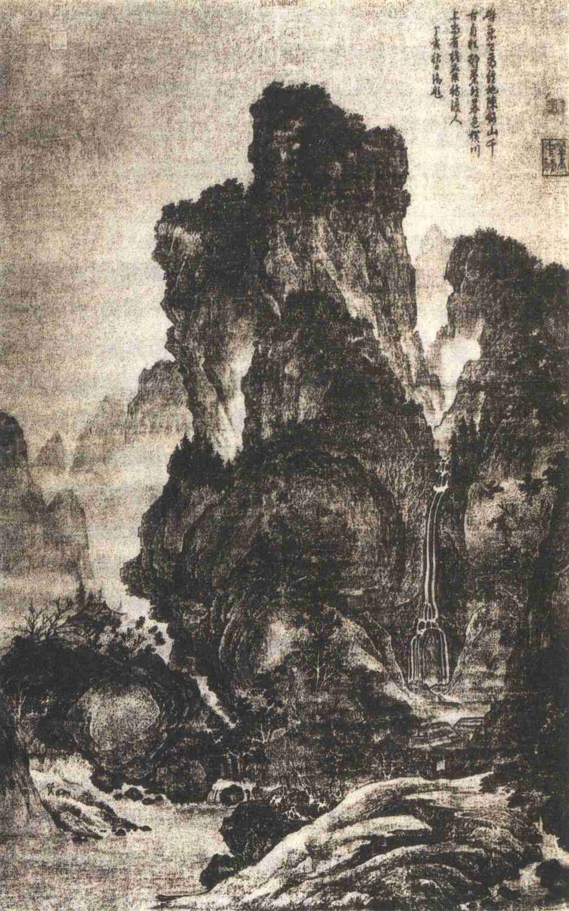 《山溪待渡图》带有鲜明的北方特色。巍峰耸立,瀑布高悬;坂垅、冈阜、峦岭,自近及远盘礴而上;楼阁掩映,远山迷濛;气势堂堂,景意幽深。