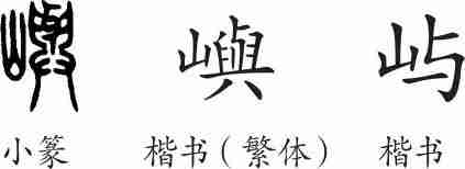 “屿”为形声字。小篆从山,与声。隶变后楷书写作“嶼”。汉字简化后写作“屿”。