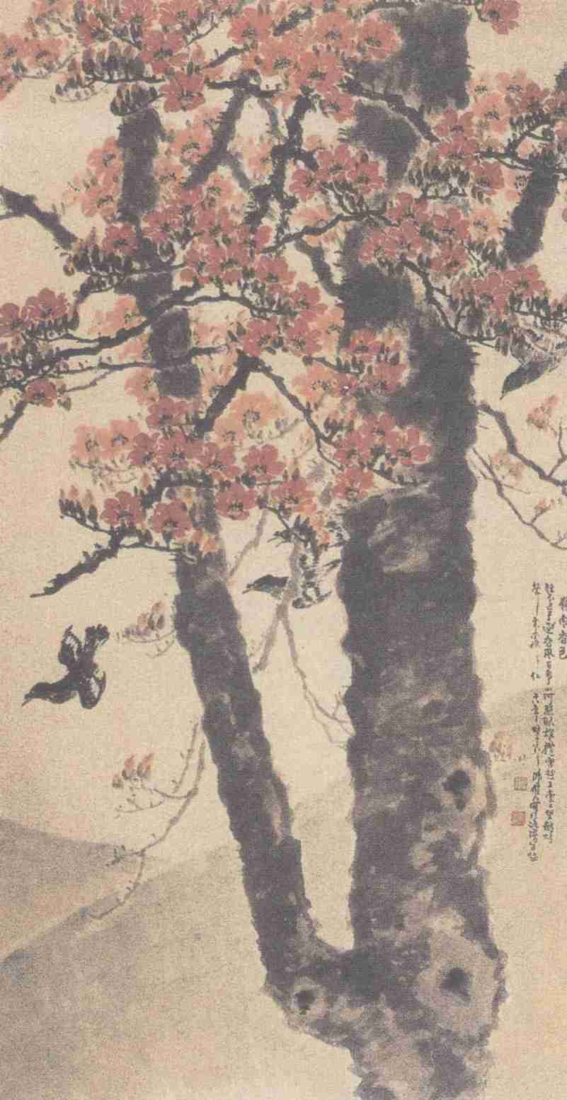 《岭南春色图》具有典型的岭南画风,也是陈树人的代表作,它曾获1929年比利时万国博览会的最优等奖。此图的幅面很大,景物不多:一株盛开的木棉,几个飞翔的鹧鸪,背景是天空和浅坡斜冈。题诗曰:“短衣匹马逐春风,百粤山河照眼雄。揽辔越王台上望,鹧鸪声里木棉红。”画家意气风发却又感慨深沉,他眺望壮阔的山河,偏偏独取木棉、鹧鸪,欣欣向荣的春色和壮志未酬的阵阵苍凉混杂在一起,沉雄又略带悲壮,使《岭南春色图》的意境趋向博大深邃。