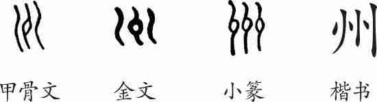 “州”是象形字。甲骨文自上而下的三条曲线表示河流,中间的小圆圈表示水中的一块陆地。金文、小篆与甲骨文大致相同。隶变后楷书写作“州”。