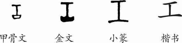 “工”是象形字。甲骨文、金文都像古人夯筑墙时用的夯杵之形。小篆线条化,就看不出字的原型了。隶变后楷书写作“工”。