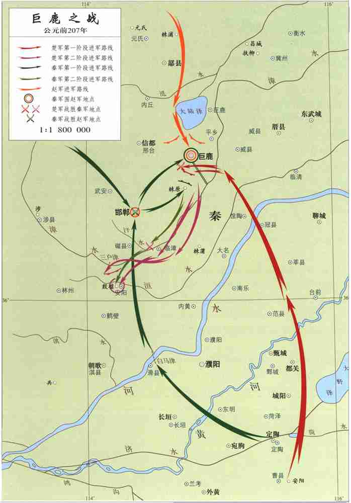 秦二世三年(公元前207年),在灭秦战争中,楚将项羽率军在巨鹿(今河北平乡西南)以少胜多、全歼章邯所率秦军主力的战略性决战。