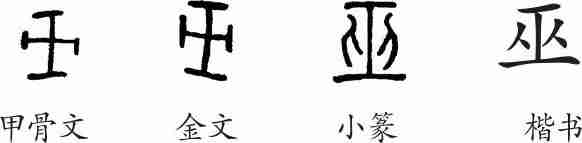 ”和“I”形,很像古代的度量工具,也有人认为像古代女巫所用的道具。隶变后楷书写作“巫”。