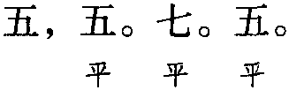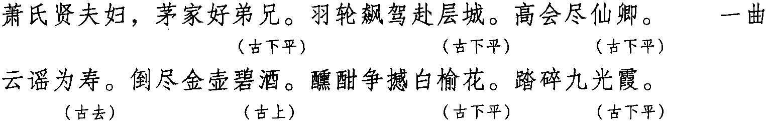 注:本词例押古下平声“庚” “麻” 韵,古上声“有” 韵,古去声“宥” 韵。因 “有” “宥” 在现代韵中同 “收” 韵,故本调仄声可押收部 “收” 韵;“庚” 在现代韵中同 “声” 韵,“麻” 在现代韵中属 “花” 韵,。故本调平韵可押东部 “声” 韵,花部“花” 韵。
