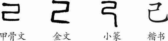 “己”是象形字。甲骨文、金文、小篆的形体大致相同,都像系在箭上用来射飞鸟的弯曲的绳索,是“弋”的早期文字。隶变后楷书写作“己”。